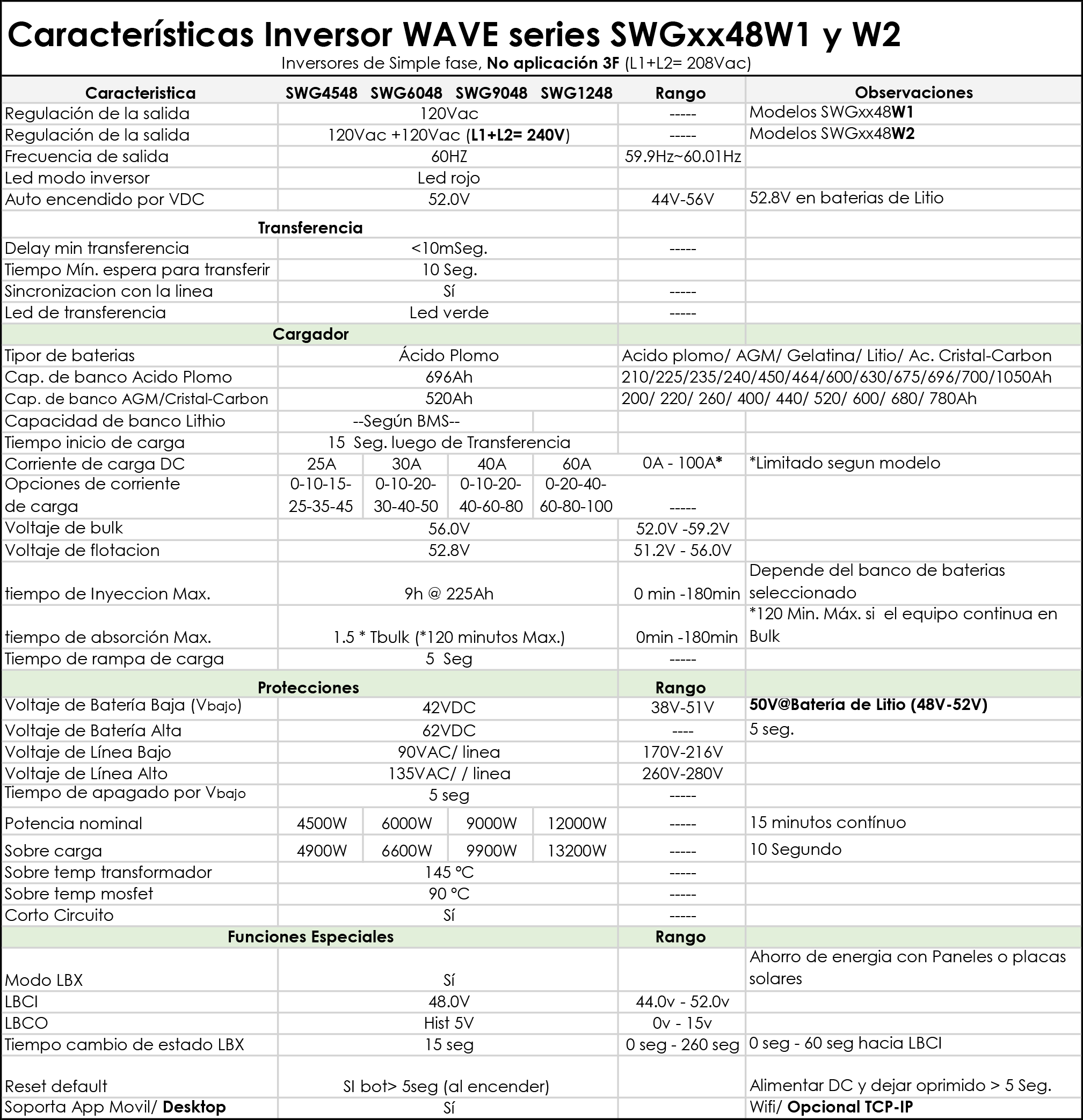 SWG4548W1/ SWG4548W2 / SWG6048W1/ SWG6048W2: Inversor SWG, 4.5Kw/ 6.0 Kw, sal. AC 120 Vac/ 240Vac, Ent. Dc 48 Vdc + Wiffi.