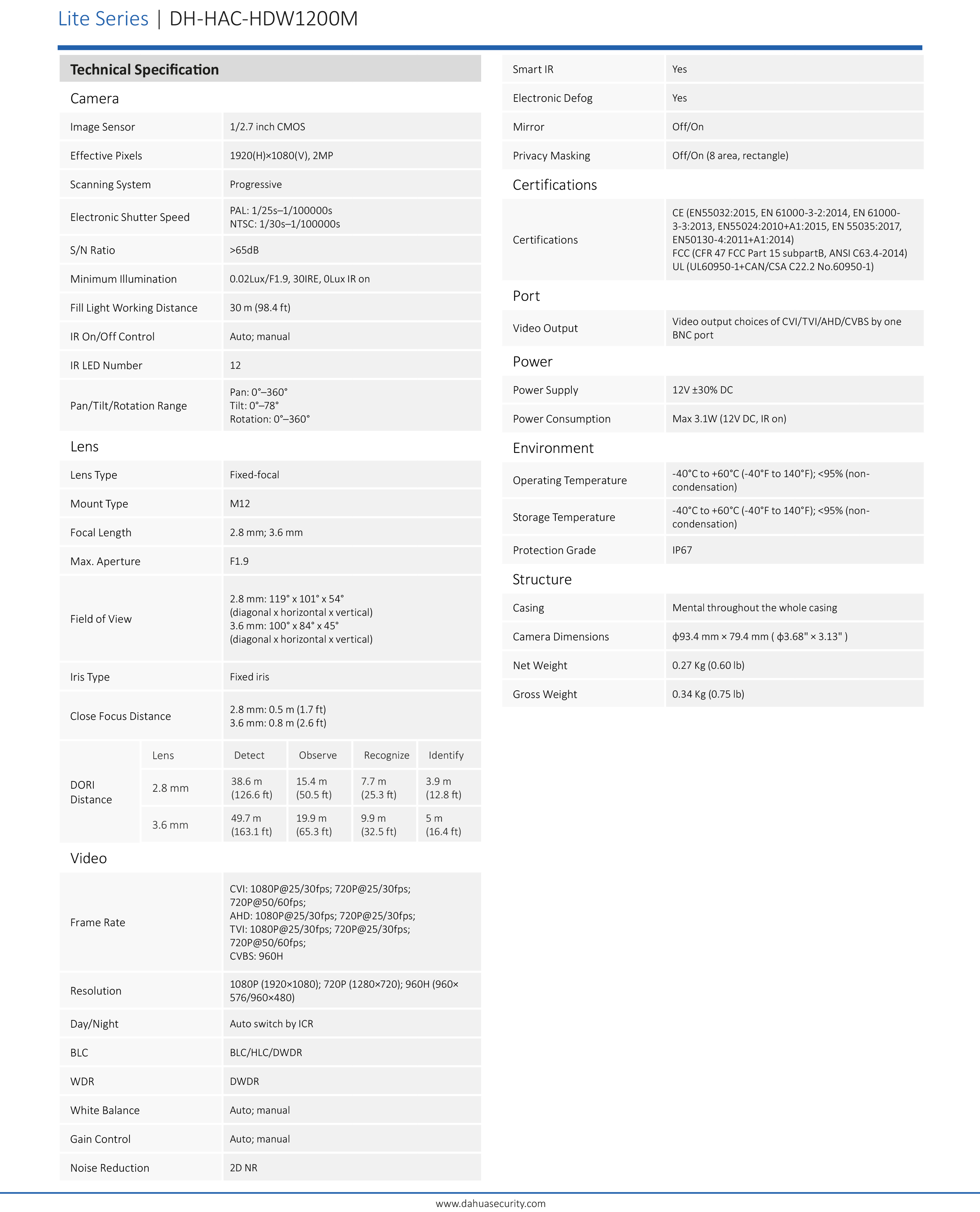 Sensor CMOS 1/2.7" 2 Megapíxel. 30fps@1080p. Día/Noche (ICR)/ AWB/ AGC/ BLC/ 2DNR. Lente fijo 3.6mm. Distancia máxima de IR 30 metros/ Smart IR. IP67 (Certificado para exterior a prueba de agua). DC12V