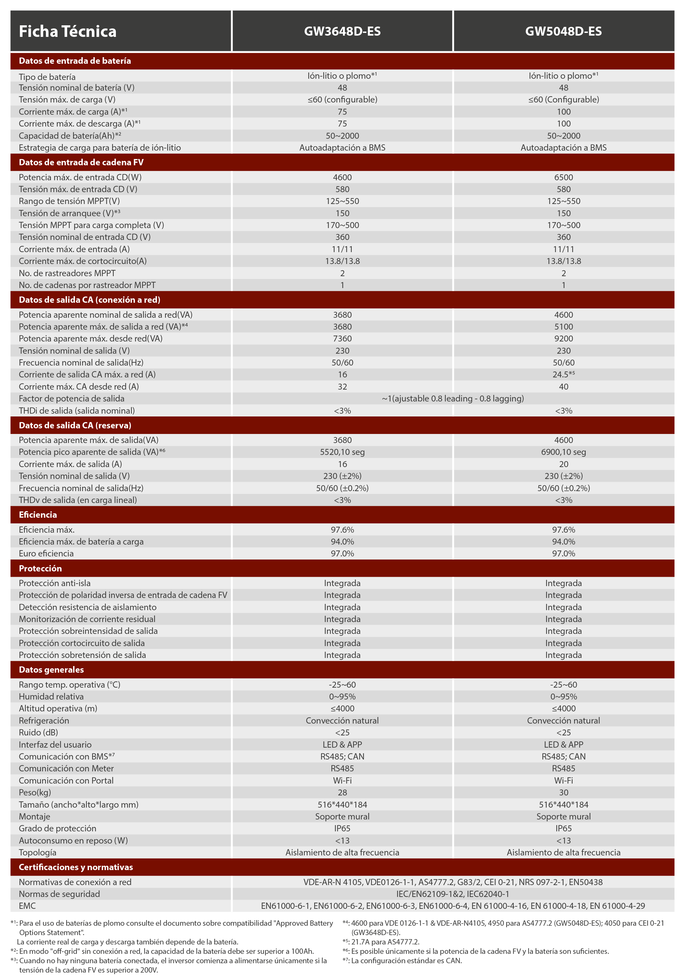 Inyección a Red y Baterías: PVmax= 580V, Vout AC= 220V, Max. Pot. Entrada= 6650W, Pmax. Salida= 4600W, Pmax. Inyección= 4950W, 2 MPPT= 125~550V, Max. Efic. Inyección= 97.6%, Con WiFi, IP65, Interfase Usuario= LED & App